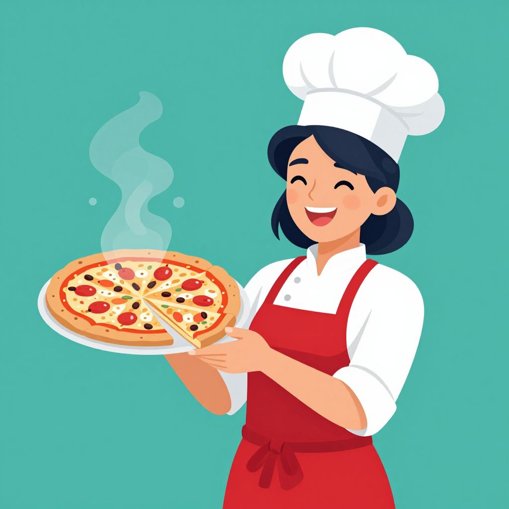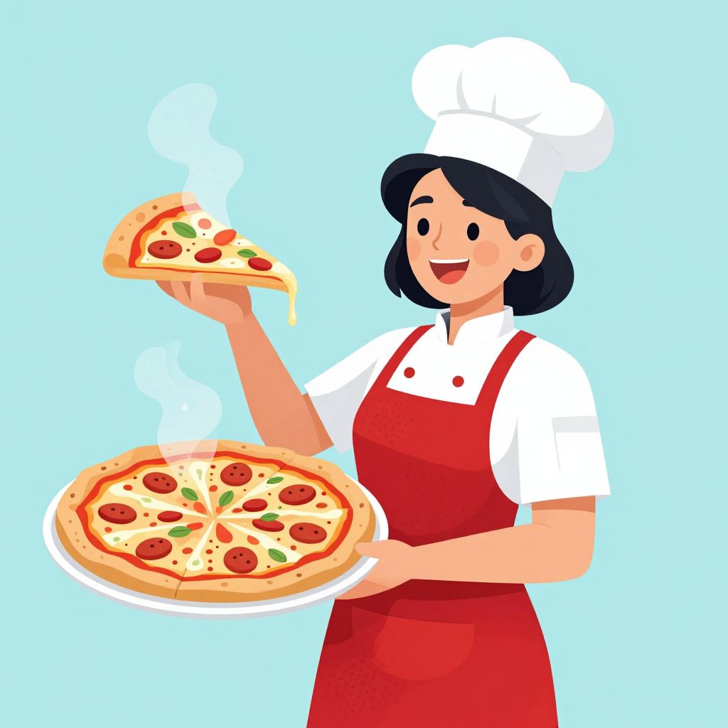 A vibrant vector illustration depicts a cheerful woman chef in a red apron and white chef's hat, proudly presenting a freshly baked Italian pizza with steam rising from a slice she holds, showcasing a classic cartoon-style depiction of culinary delight.