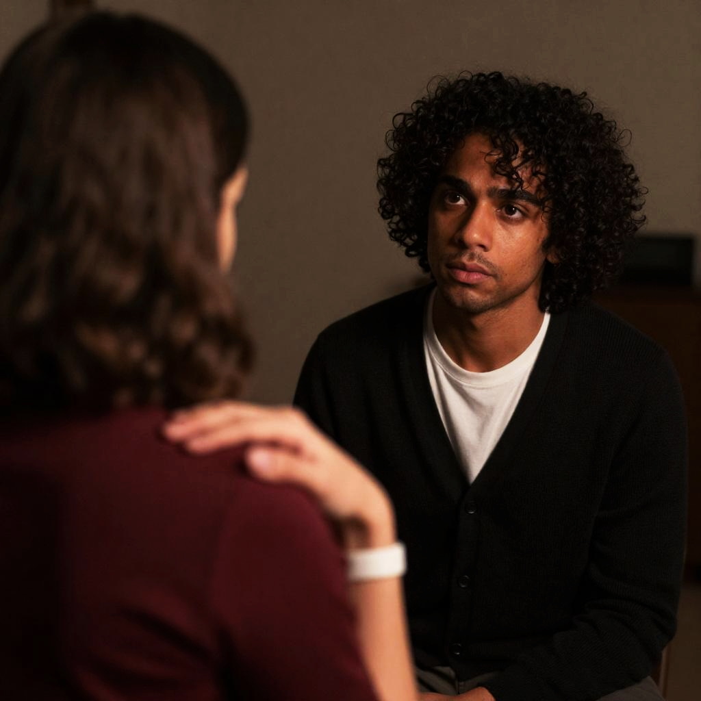 Photograph of two people in a dimly lit room. A curly-haired man with olive skin and intense gaze, wearing a black cardigan over a white shirt, sits facing a woman with brown hair, red top, and white wristband. Her back is to the camera. She rests her hand on his shoulder.