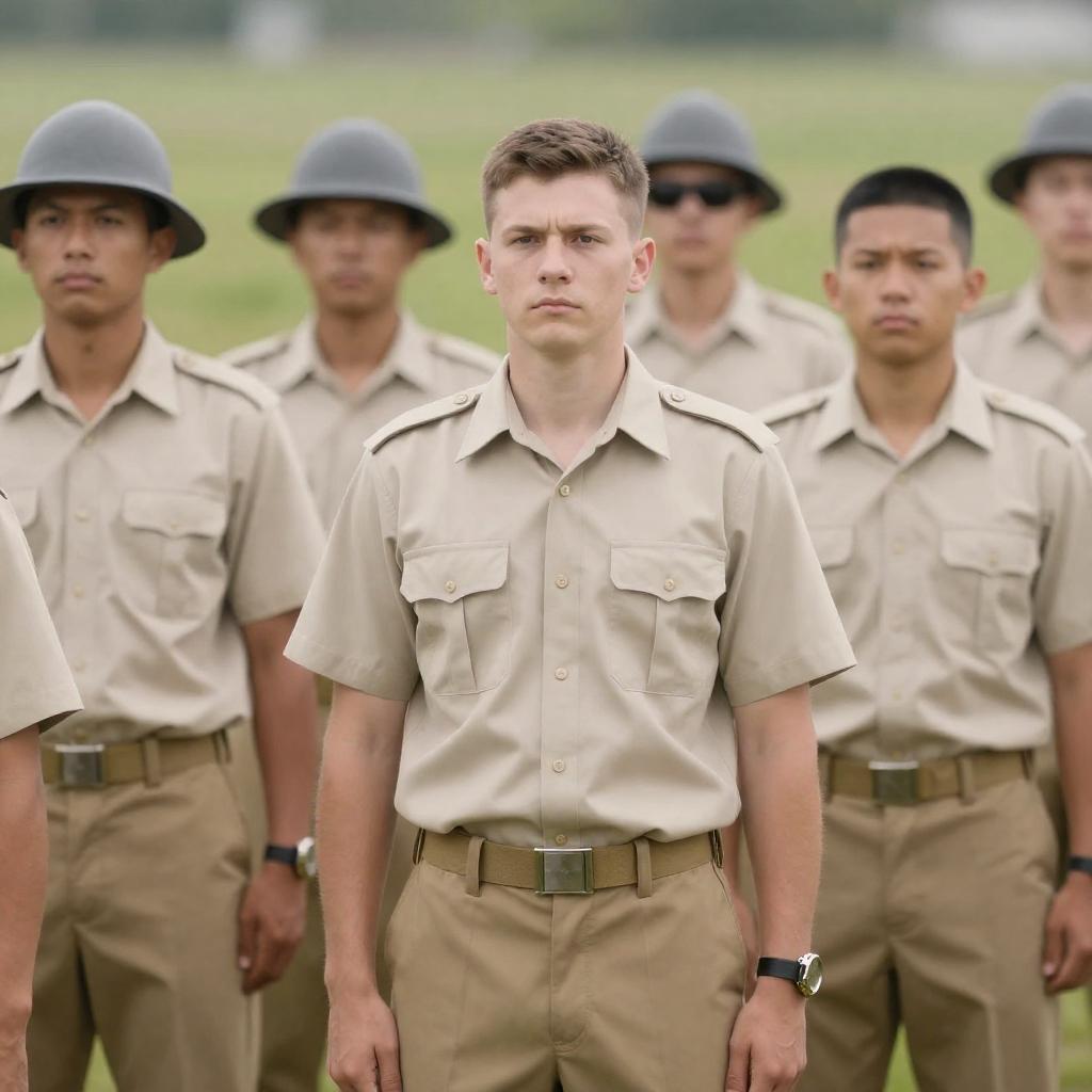 Photograph of a young white man with short brown hair, wearing a green military uniform with blue shoulder straps and a gold button. He stands in front of a grassy field with military vehicles and buildings in the background. The sky is overcast. His expression is serious and focused.