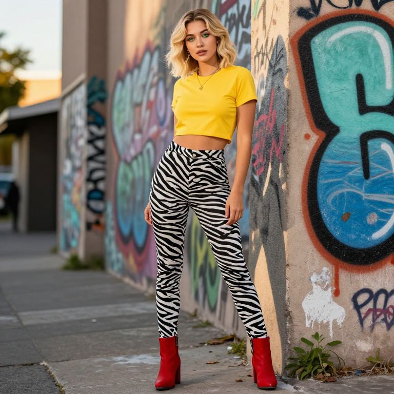 A stylish urban fashion enthusiast in her early 20s with fair skin, short wavy blonde hair, and bright green eyes, wearing zebra print pants that are slim-cut and trendy, paired with a yellow crop top and red ankle boots, posing near a graffiti-covered wall in a street-style neighborhood at golden hour.