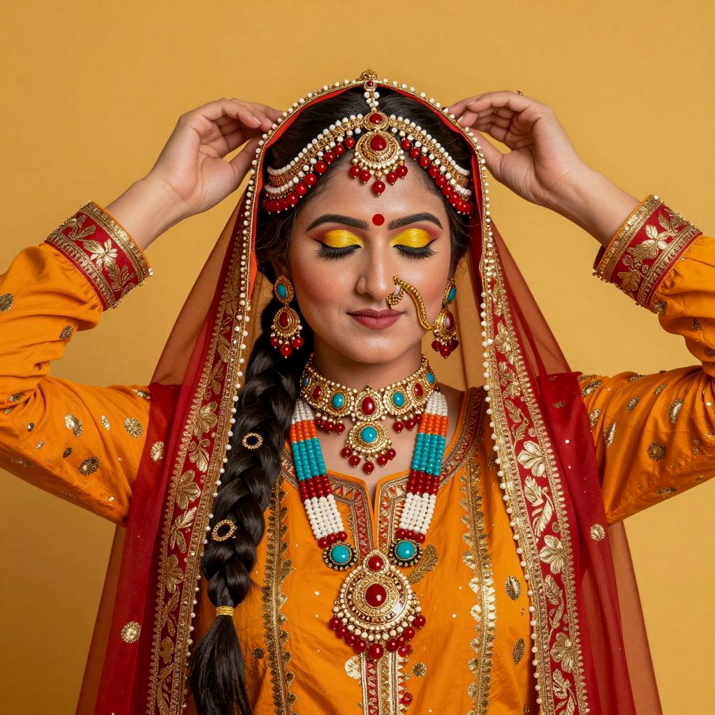 Indian woman in traditional attire, front view. Bright orange dress with red and gold patterns, intricate headpiece with red and white beads. Detailed face makeup with yellow eyeshadow, red bindi. Braided hair. Large, colorful necklace with beads and pendants. Earrings with turquoise and gold. Hands raised, holding headpiece. Yellow background.