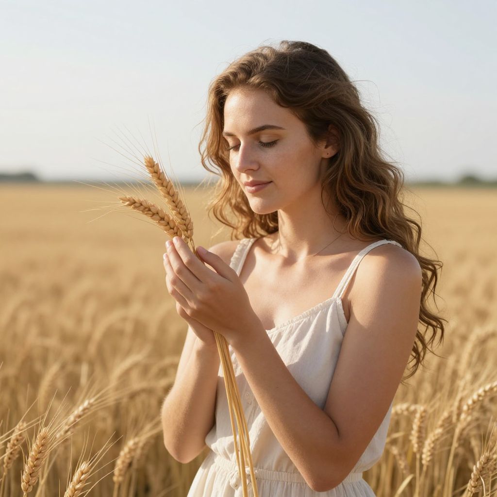 Photograph of a young woman with long brown hair, wearing a white sundress, gently holding a stalk of golden wheat in a sunlit field.