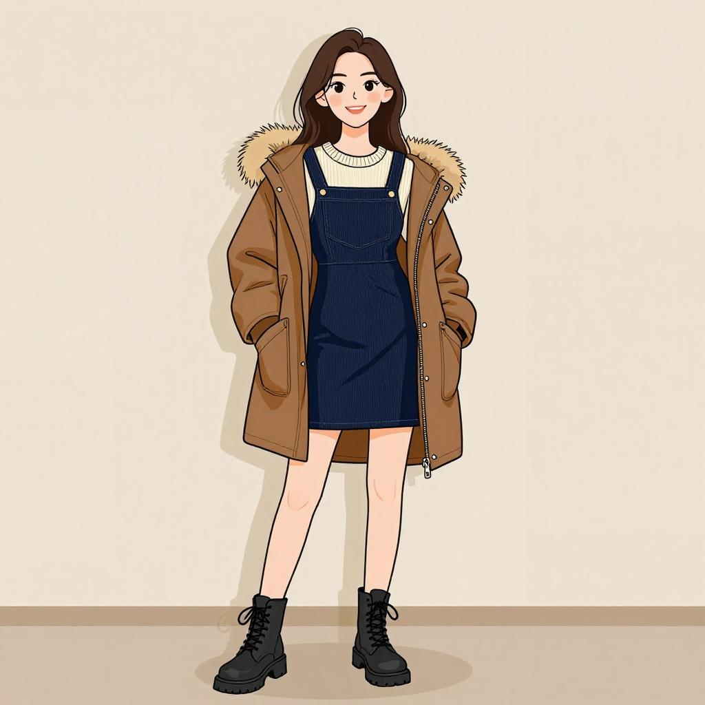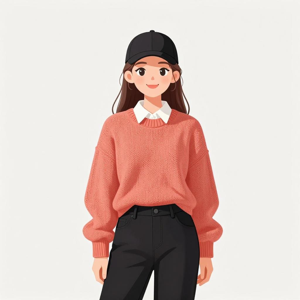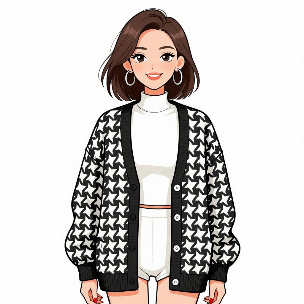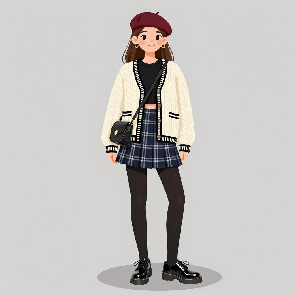 Woman with pretty face and pretty hair. smiling Woman, preppy chic, cream cable-knit cardigan with contrasting black trim, black cropped top underneath, navy plaid pleated mini skirt, opaque black tights, black patent leather lace-up shoes with chunky sole, maroon beret, black leather crossbody bag with rounded shape. Plain light gray background with slight shadowing near the bottom. --sref 1467