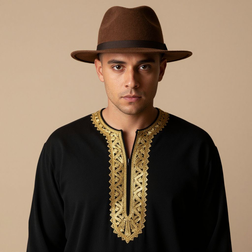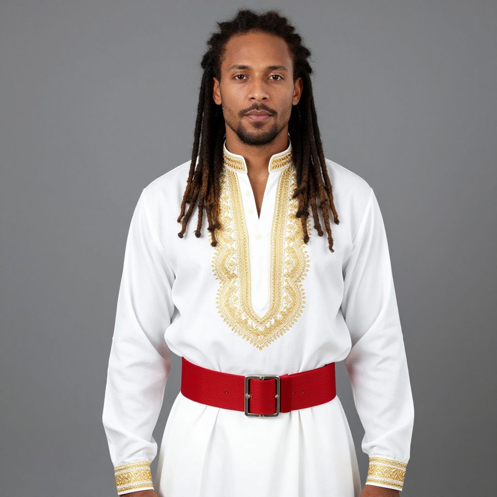 Man with dreadlocks wearing a white shirt with gold embroidery and a red belt.