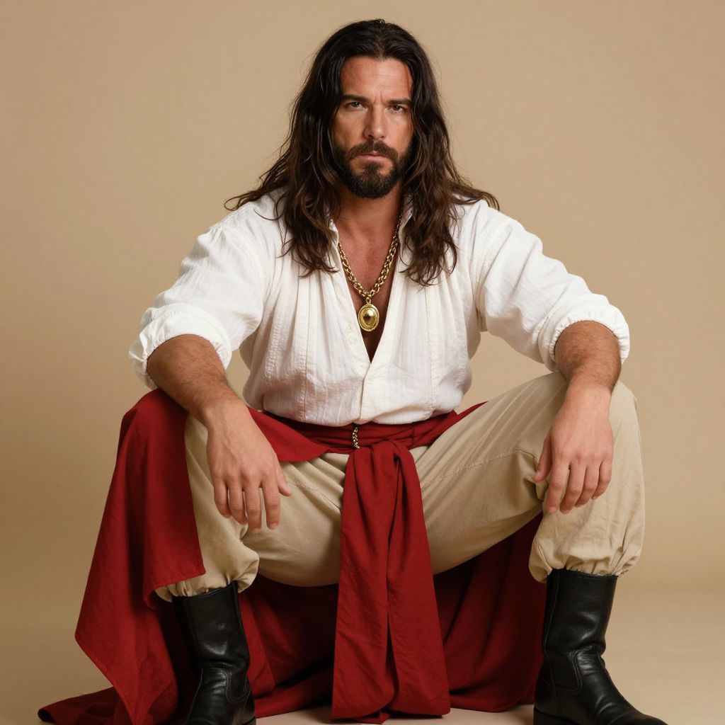 Photograph of a rugged, white man with long, dark brown hair and a thick beard, sitting with legs spread apart. He wears a white, slightly wrinkled, long-sleeve shirt with the top buttons undone, revealing a gold necklace. His beige pants are tucked into black leather boots. A red sash is tied around his waist, draping over his legs. The background is a plain beige, highlighting his pirate-like attire and intense, focused expression. The lighting is even, emphasizing the textures of his clothing and the subtle shadows on his face and body.
