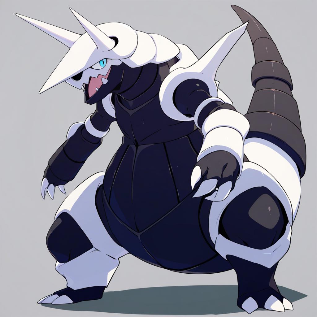 Digital artwork of Aggron, a steel and rock type Pokemon creature, featuring prominent horns, blue eyes, and sharp claws. The character is depicted in a dynamic pose with a detailed armor-like body, inspired by the art style of Wlop and Animagine.