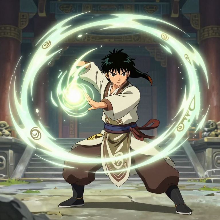 Airbender OC controlling a powerful gust of air in an ancient temple courtyard, traditional bending attire with intricate patterns, wind swirls forming symbols in the air, soft glowing light, anime-inspired fantasy illustration, epic and serene atmosphere