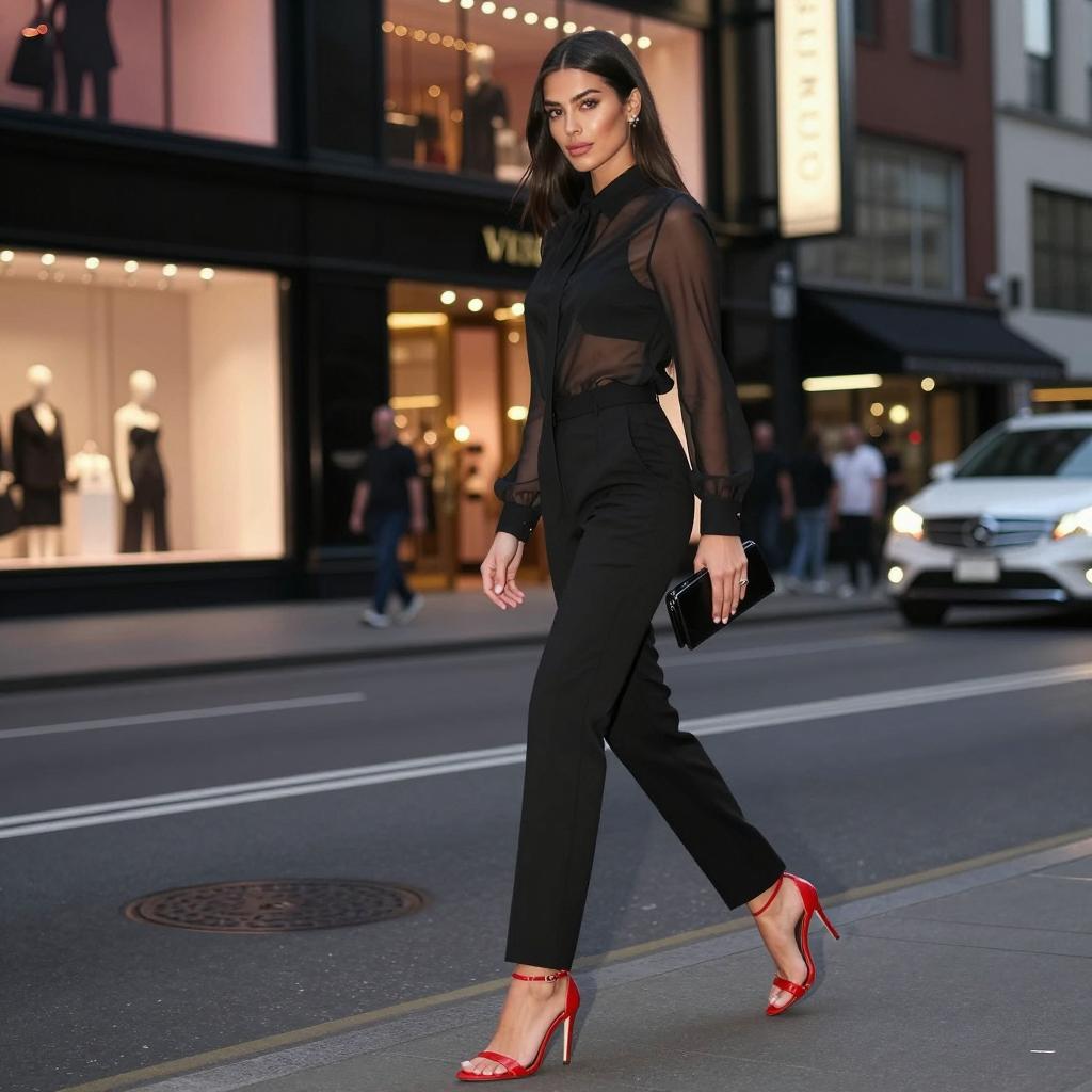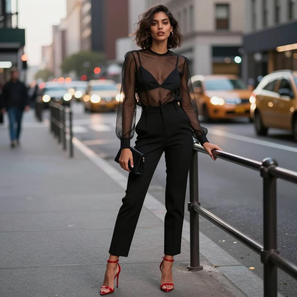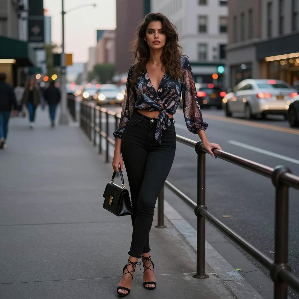 Victoria's Secret style inspiration, chic full-body portrait of a fashion model standing on a city street, olive-skinned woman with sleek ponytail and red lipstick wearing black high-waisted skinny jeans and a patterned wrap blouse with patent pumps and bold statement earrings posed resting one hand on a nearby railing, legs crossed at the ankles in industrial city block with brick walls and parked cars, glamorous evening street fashion photography, high contrast, ultra-detailed
