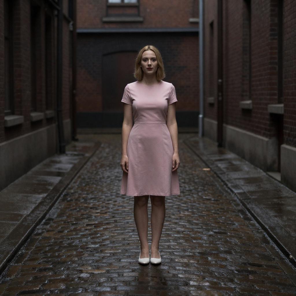 Photograph of a woman with light skin and blonde hair, wearing a pink dress and white shoes, standing in a dimly lit, narrow, wet, cobblestone alley. She is centered, facing forward, with a brick wall in the background. The alley is flanked by dark, shadowy buildings.