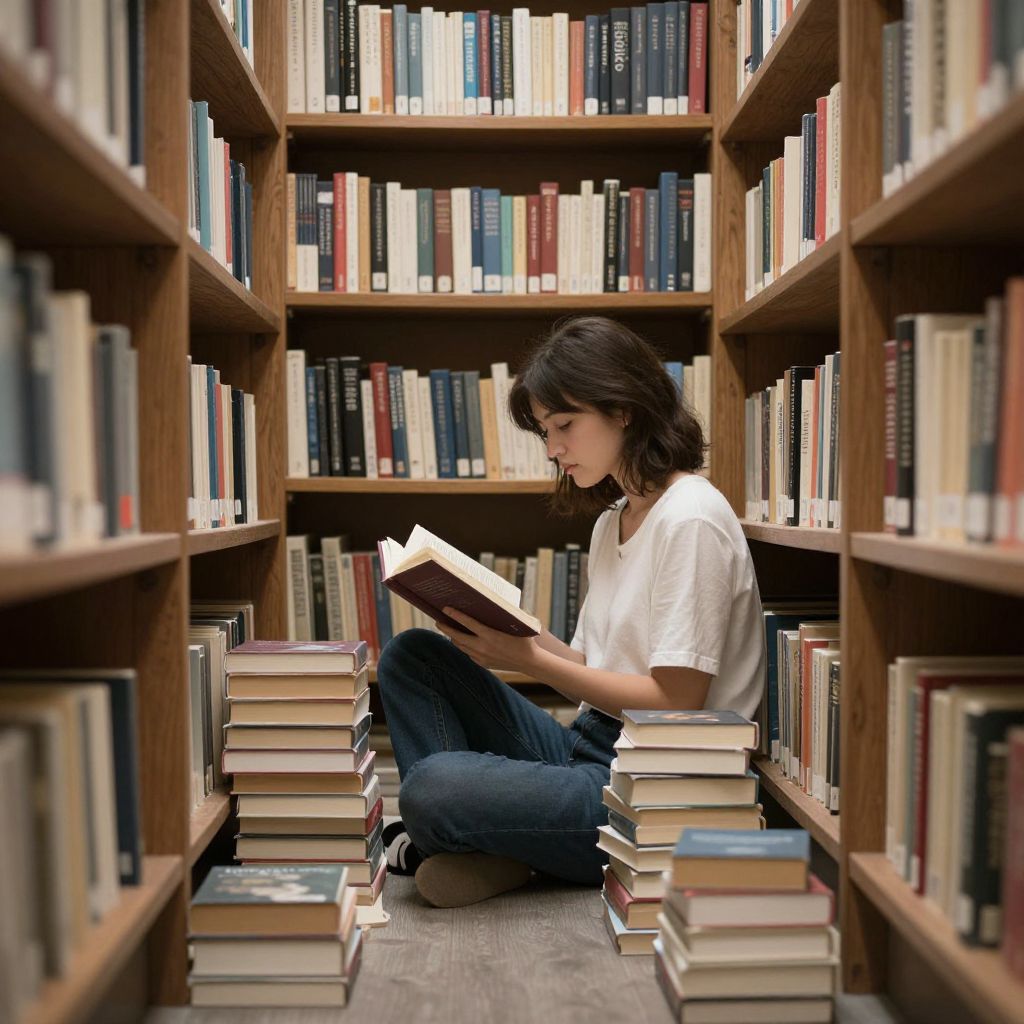 Woman engrossed in reading amidst towering wooden bookshelves, surrounded by scattered stacks of books under soft, diffused light.