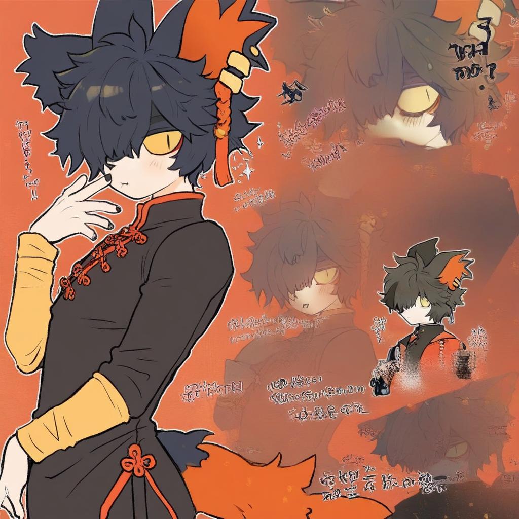 Digital illustration of an anime-style male cat character with black short hair, yellow slit pupils and yellow sclera. The character has black and orange cat ears, a tail, and black nails, wearing traditional black Chinese clothing with orange and yellow accents. The artwork features multiple faded poses and expressions of the character against an orange background, highlighting elements like ear piercing and hair covering one eye.