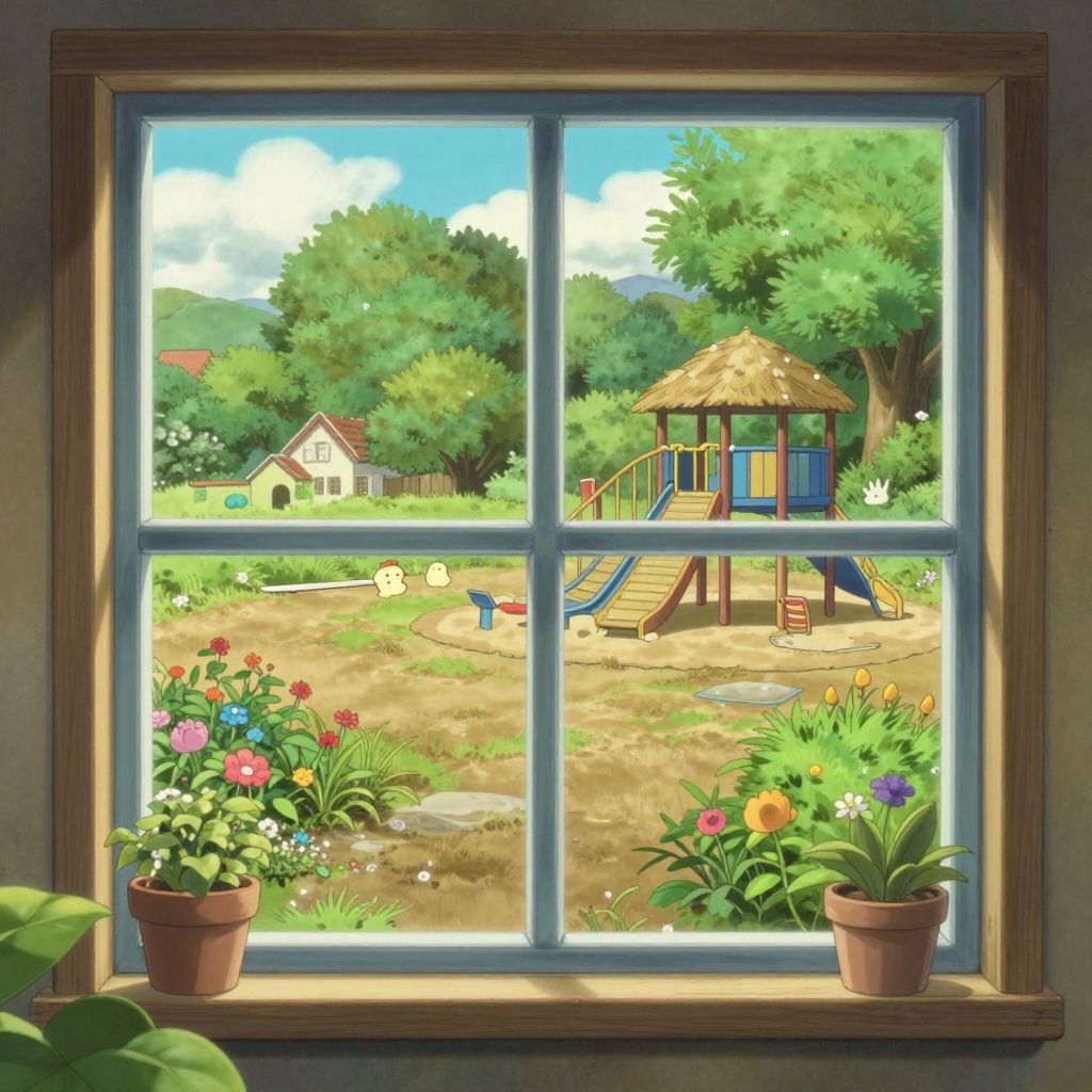 Window Treatments childrens book background, garden with playground, landscape, anime key visual, highly details, studio Ghibli, toon shading, toon shading, by Andrew Bosley, cute,