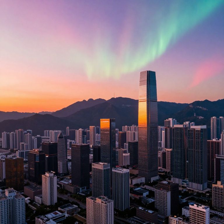 Aerial view of a modern city skyline at sunset with tall skyscrapers reflecting warm orange and pink light. Majestic mountain peaks rise in the background under a vibrant technicolor aurora borealis illuminating the sky. The image captures the dynamic blend of urban architecture and natural beauty in twilight.