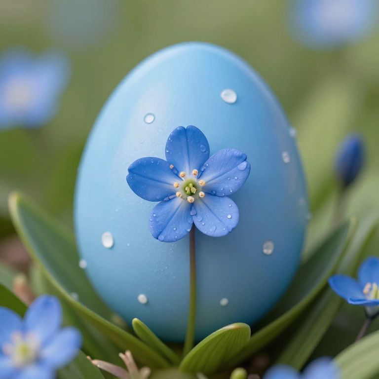 Photograph of a blue egg with dew drops, adorned by a blue flower with water droplets, surrounded by green leaves and blurred blue flowers in a