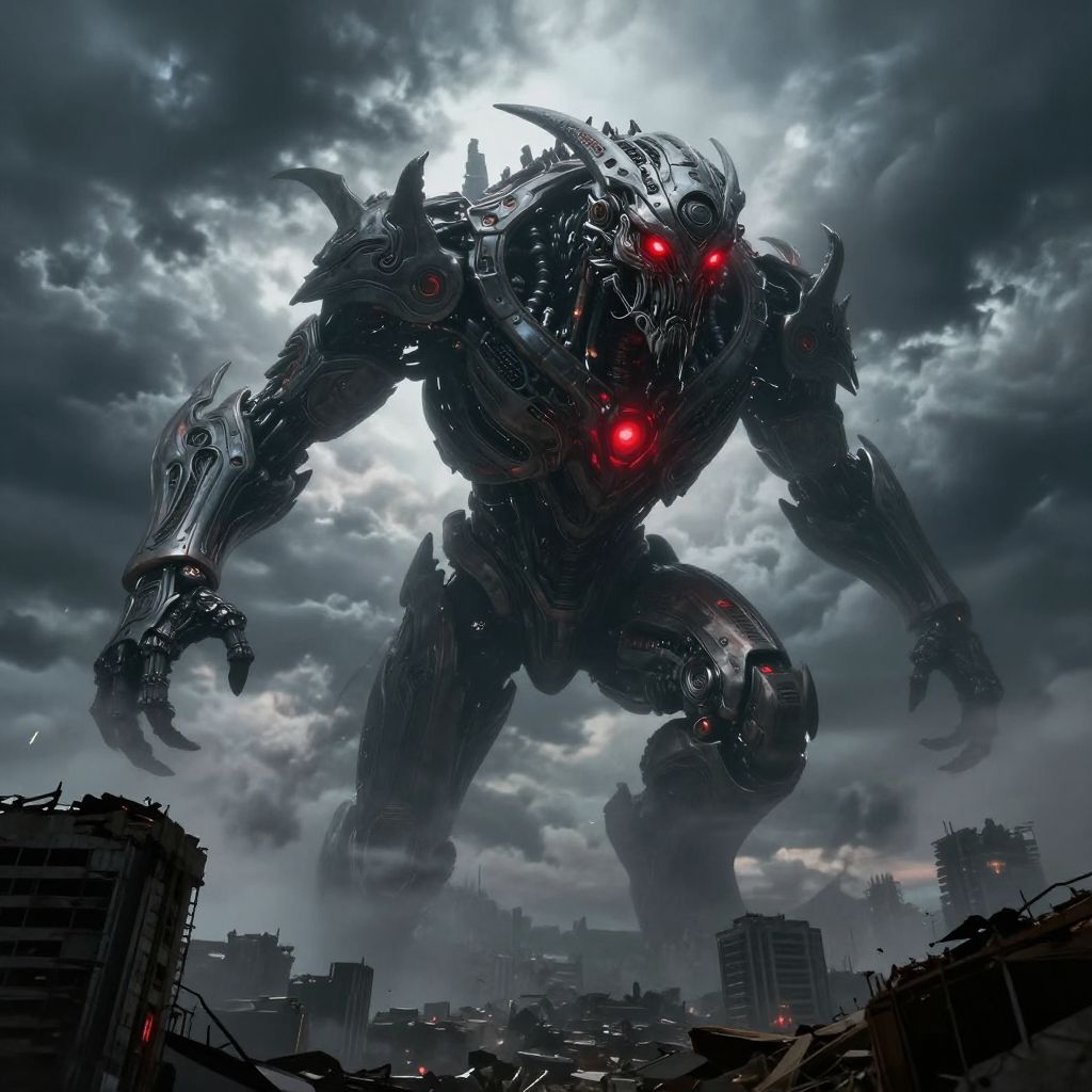 Monster AI generator painting futuristic augmented monsters powered by advanced AI, glowing circuitry on rugged skin, urban ruins lit by flickering neon signs, misty atmosphere, surreal and ominous mood, ultra-detailed concept design