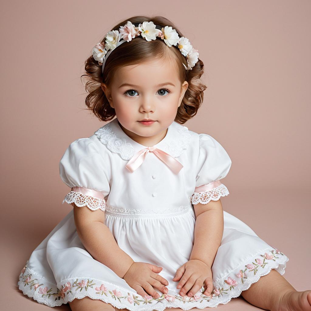 Baby catholic baptism outfit, photograph of a cute baby girl, sitting, white dress with lace trim, short puffed sleeves, white collar, floral embroidery, pink and white flower headband, light skin, brown hair, blue eyes, soft pastel background, neutral lighting, child sitting with hands on dress, innocent expression, studio portrait, delicate and gentle atmosphere