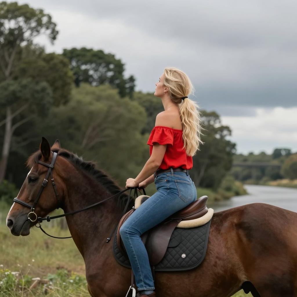 Blonde woman with braided hair in checkered bikini top and denim shorts rides black bike on grassy lakeside path. Black sunglasses, grassy bank, lake with boats, trees in background. Bicycle has black basket with small items. Daytime, clear sky.