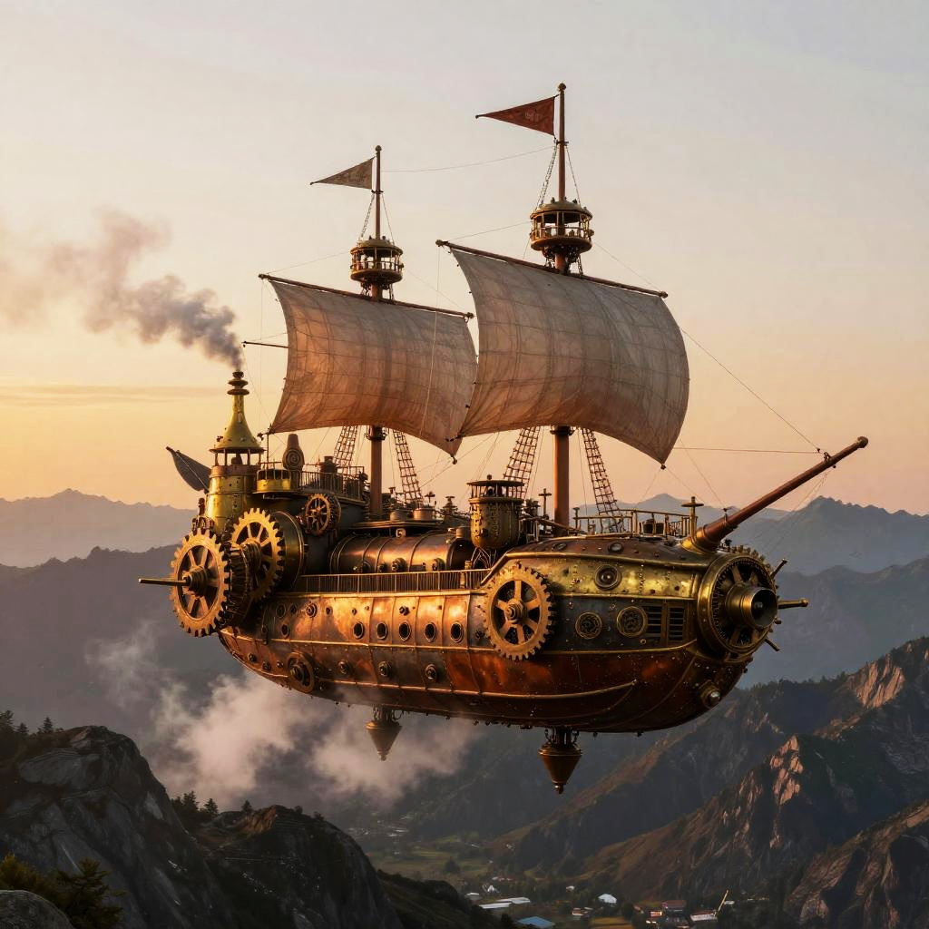 Stockard, a detailed steampunk airship soaring above rugged mountains at dawn, intricate mechanical design with brass and copper elements, billowing steam and gears, warm orange light highlighting adventurous spirit