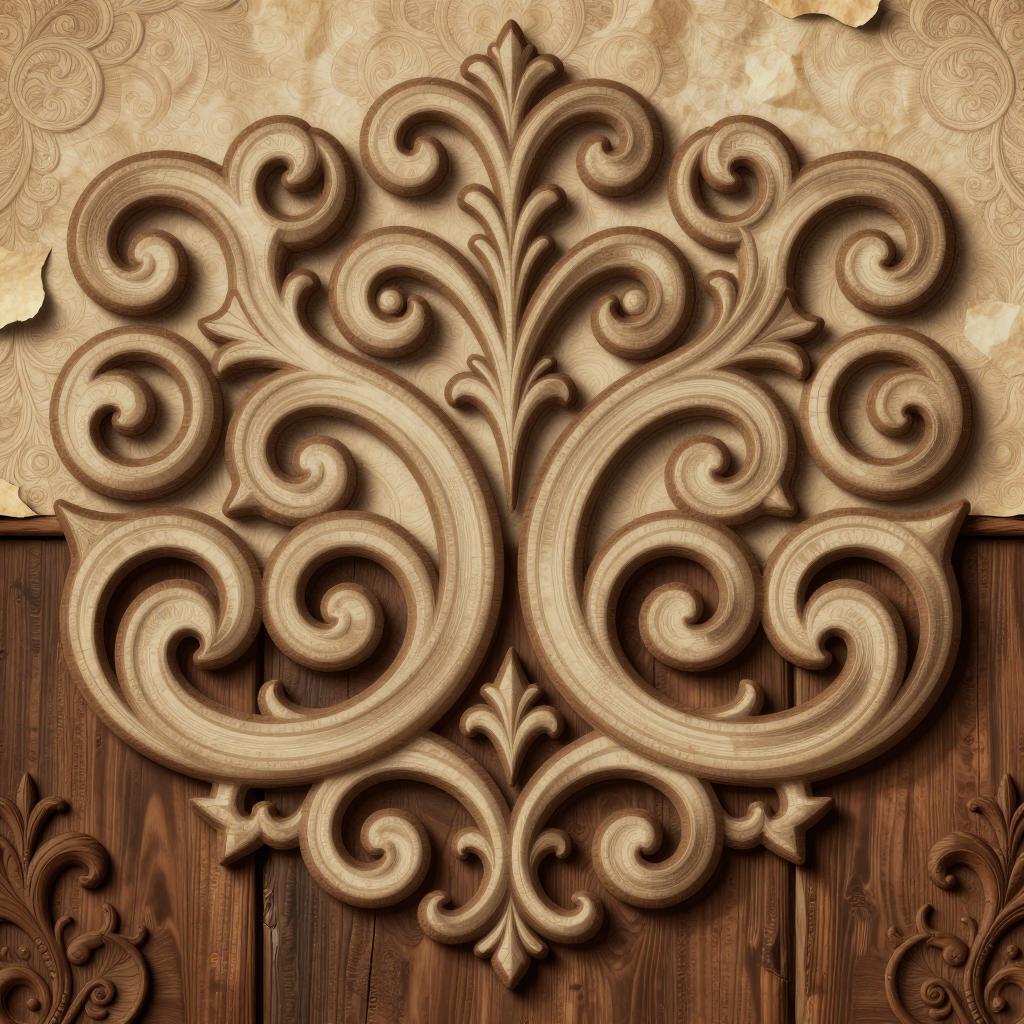 Scrollworks pattern featuring tattoo-style scrollwork with bold outlines and negative space in sepia brown scrollwork on aged paper arranged as scrolls arranged as a crest at the top of the image on carved dark wood panel rendered as highly detailed digital illustration with subtle embossing and soft shadows, ultra-detailed, sharp ornamental design, high resolution, intricate decorative pattern art