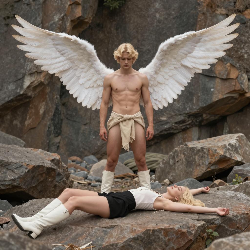 A male angel with large, feathered wings, standing over a lifeless blonde woman wearing white, thigh-high boots and a black and white top. The angel is shirtless, with a beige loincloth, standing on rocky terrain with ured, layered rocks in the background. The woman is lying on her back, eyes closed, with arms outstretched. The angel has a neutral expression, while the woman's face is relaxed. The angel's wings are spread wide, contrasting with the rocky, earthy background. Two people, rocky terrain, feathered wings, beige loincloth, white boots, black and white top.