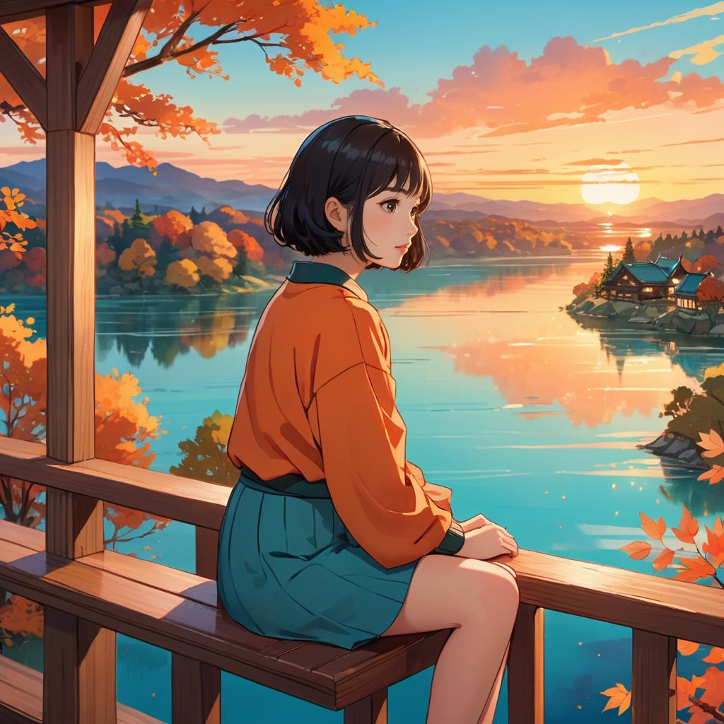 Digital anime-style illustration of a young woman with short dark hair sitting on a wooden balcony overlooking a serene lake and distant village during autumn sunset. The warm orange and teal lighting highlights the autumn leaves and calm water reflecting the sun setting behind mountains. The scene evokes a peaceful and contemplative mood.