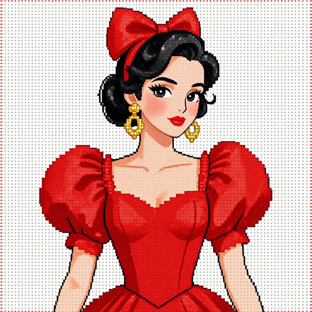 A vibrant digital illustration of an elegant woman adorned in a striking red dress and matching bow, featuring intricate gold earrings and a vintage-inspired aesthetic reminiscent of DIY 5D cross-stitch and full square diamond painting techniques.
