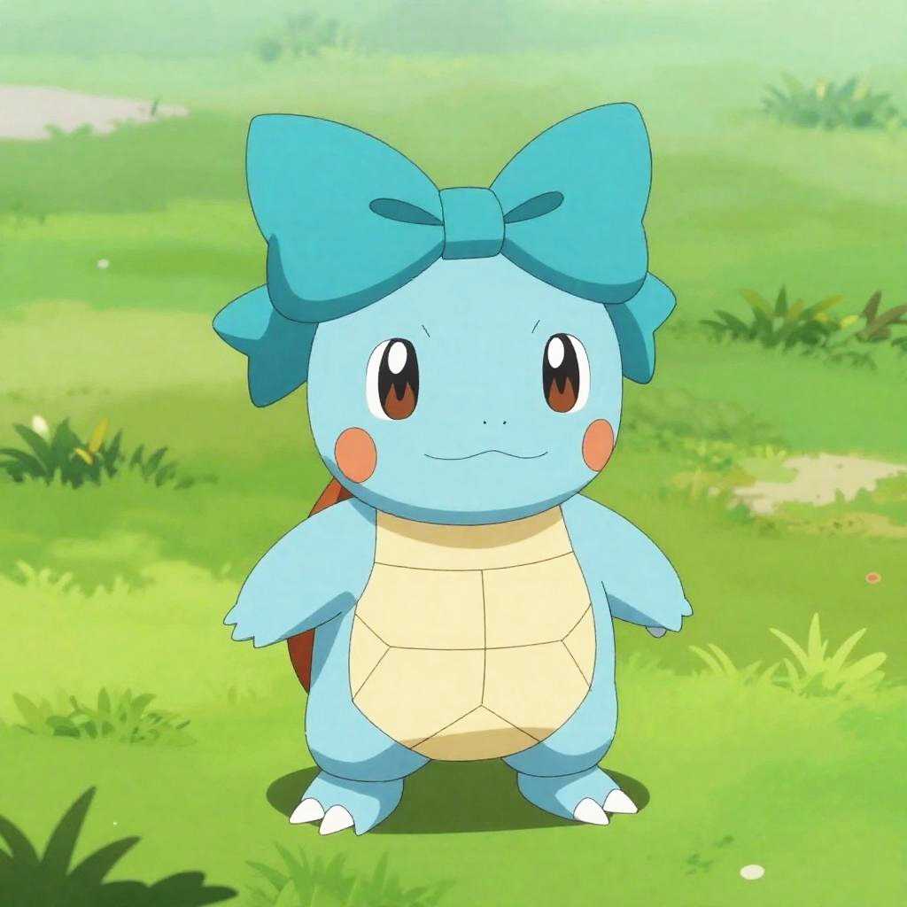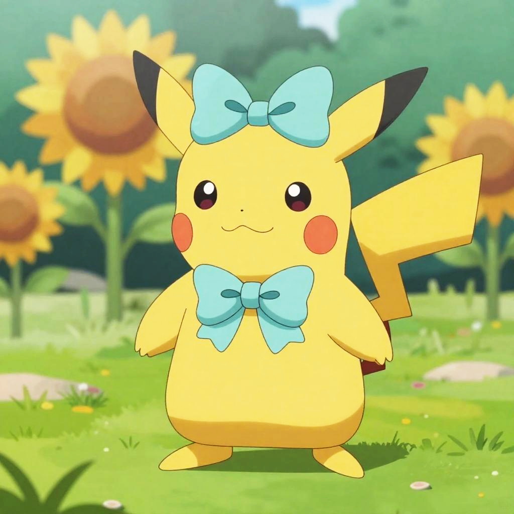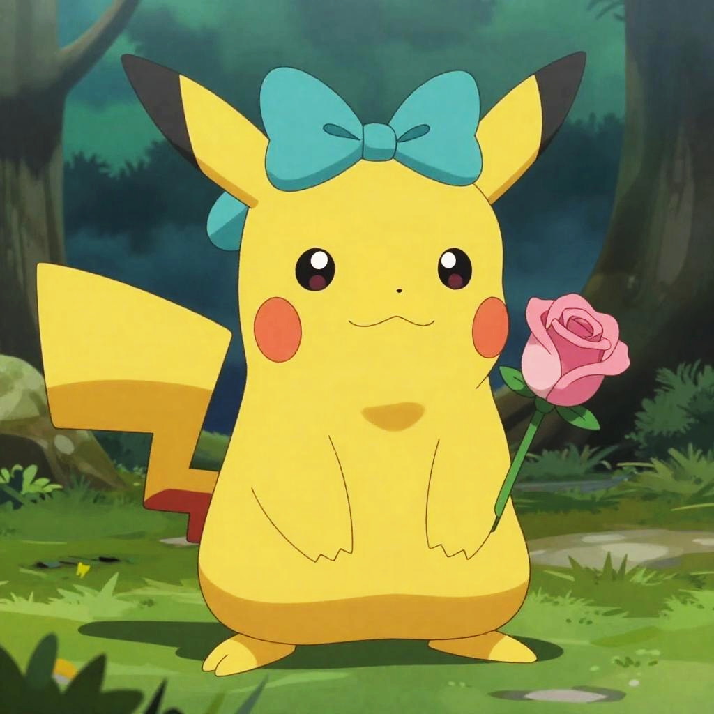 Full body, pokemon_creature, no_humans, indoors, forest, night, animal_focus, shiny_pokemon, alternate_color, sitting, looking_at_viewer, closed_mouth, blush, pink_eyes, teal_bow, rose, detailed_visual_style