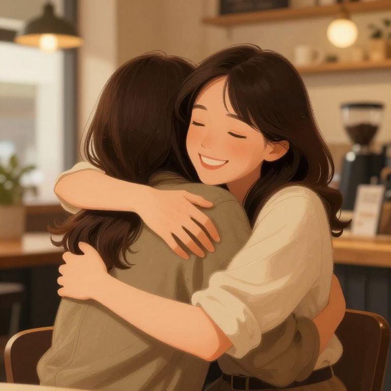 Loyal friends sharing a heartfelt hug in a cozy coffee shop, warm and inviting ambiance, soft focus on their joyful faces, realistic illustration with detailed textures and warm tones