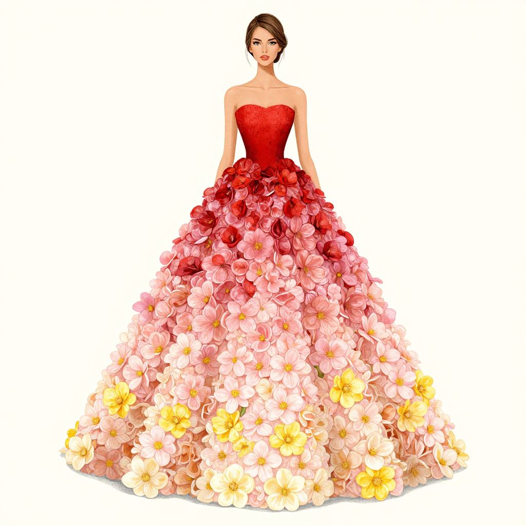 Digital illustration of a woman in a strapless, red, floral-embellished ball gown with a voluminous, multi-colored flower skirt.