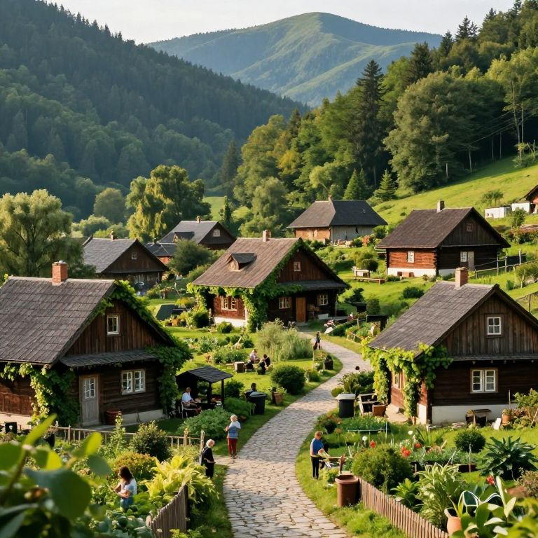 Photograph of a picturesque, sunlit rural village with wooden houses, lush gardens, and a winding cobblestone path, set against a backdrop of