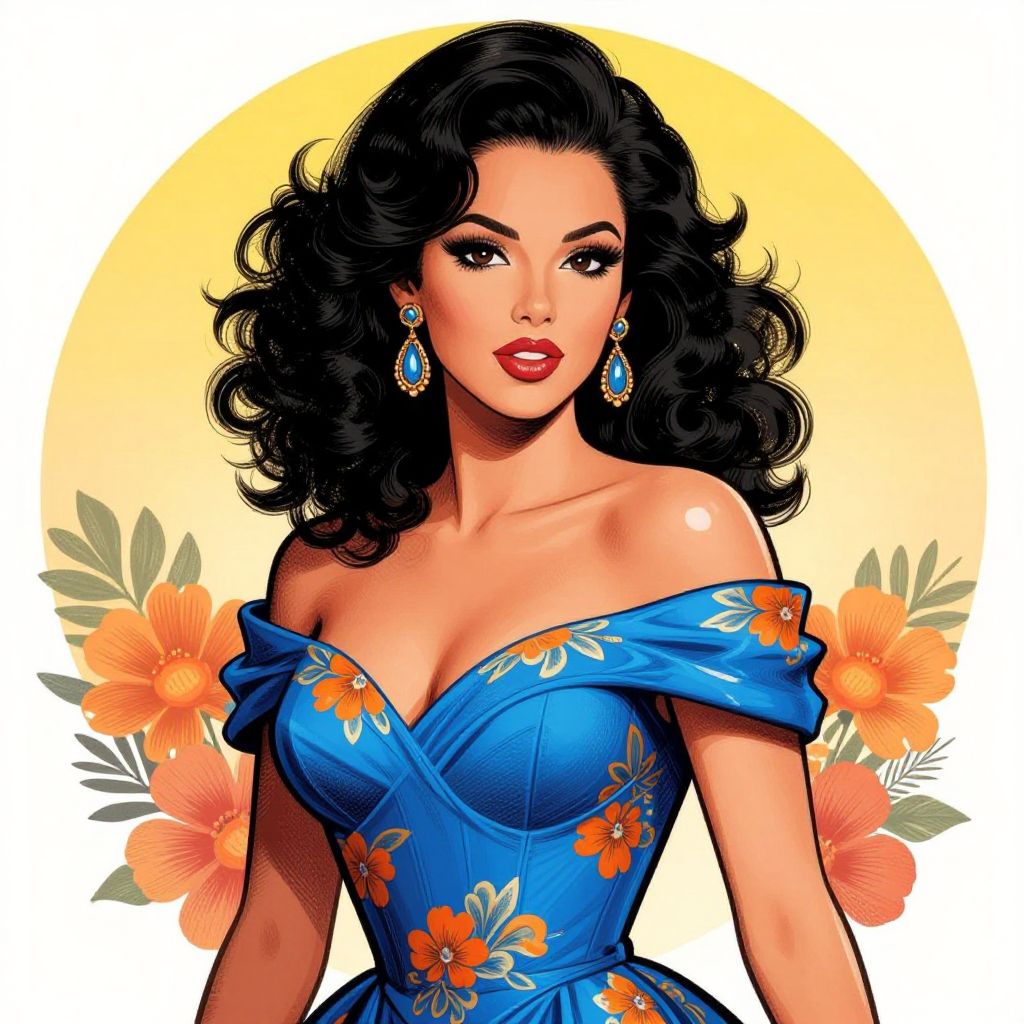 Digital illustration of a red-lipped brunette woman in a teal floral dress, standing against a dark blue background with large orange flowers. She wears gold earrings