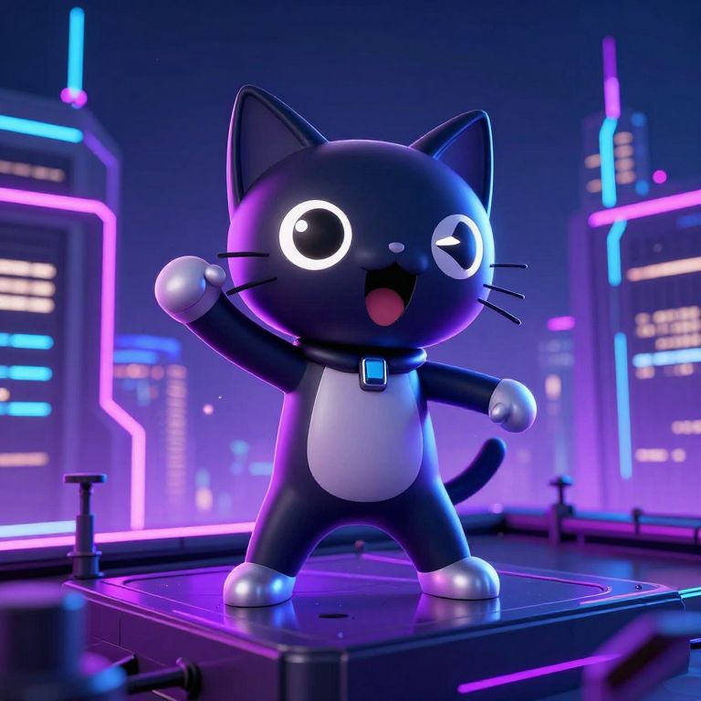 This is a digital CGI image of a stylized, anthropomorphic black cat with glowing white eyes, standing on a neon-lit platform. The cat has a white chest and paws, and wears a blue collar with a small square tag. It is posed with one arm raised and the other resting on its hip, exuding a confident, energetic vibe. The background features a futuristic cityscape with tall buildings illuminated by vibrant pink, blue, and purple neon lights. The cat's glossy, smooth texture contrasts with the sleek, metallic platform it stands on. The overall style is reminiscent of cyberpunk aesthetics, with a focus on bright, neon colors and a high-tech, futuristic atmosphere.