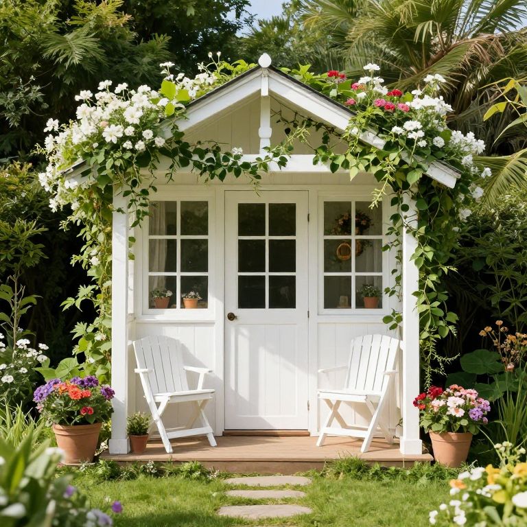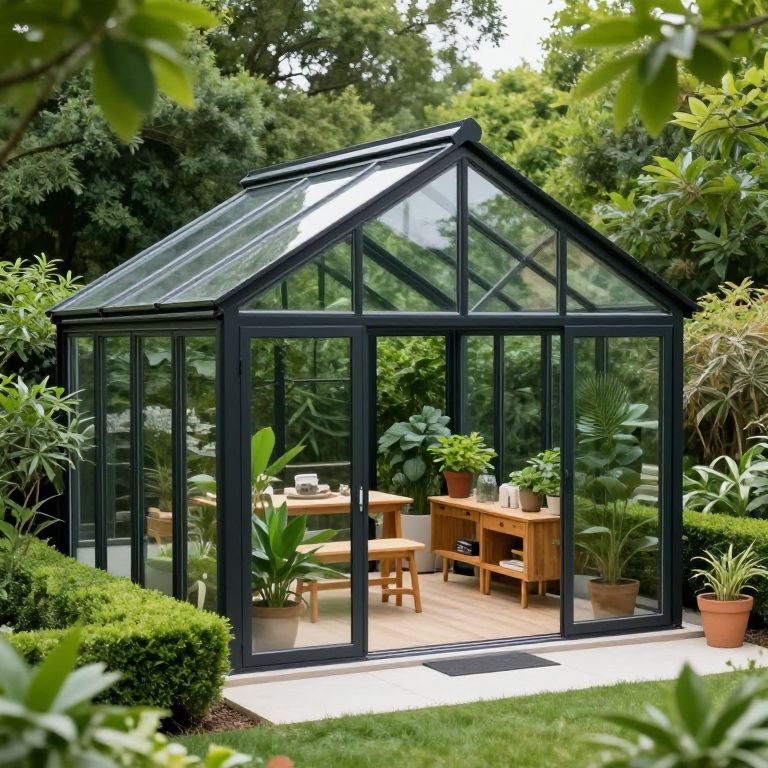 Modern black-framed greenhouse with a sloped glass roof and large sliding doors stands amidst lush greenery, featuring a cozy interior with wooden furniture, potted plants, and a tiled floor, surrounded by manicured hedges and trees.