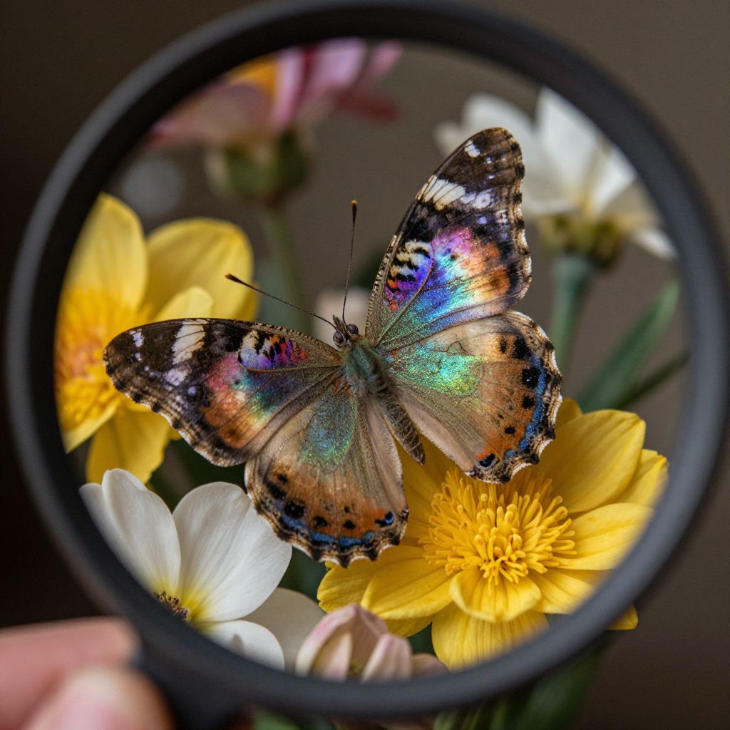Photograph of a colorful butterfly with iridescent blue, green, and orange patterns on its wings, viewed through a black magnifying glass. The butterfly is perched on bright yellow daisies and white flowers. The magnifying glass is held by a hand in the bottom left corner. The background is blurred, highlighting the vibrant butterfly and flowers. The image has high contrast and vivid colors, emphasizing the butterfly's detailed wing patterns and the flowers' textures. The magnifying glass adds a sense of depth and focus on the butterfly.
