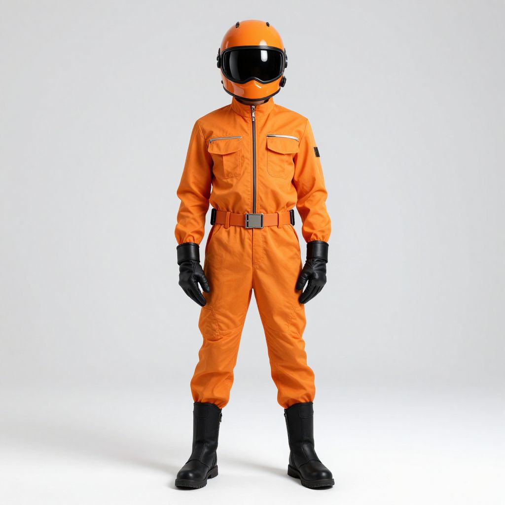 Orange flight suit costume, helmet, solo, 1boy, gloves, male focus, standing, full body, boots, black gloves, black footwear