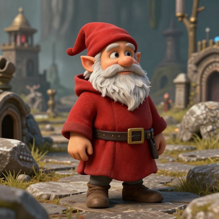 CGI image of a chubby, cartoon elf with a red hat, white beard, and red cloak standing in a medieval graveyard.