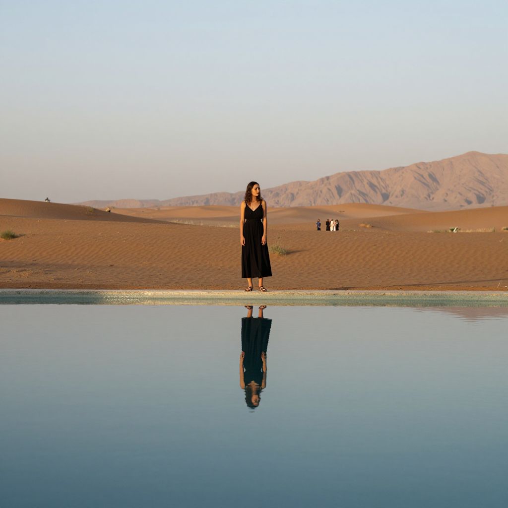 Woman standing by a tranquil pool in the desert, her reflection mirroring the serene landscape as distant figures and rugged mountains stretch into the horizon under a soft, hazy sky.