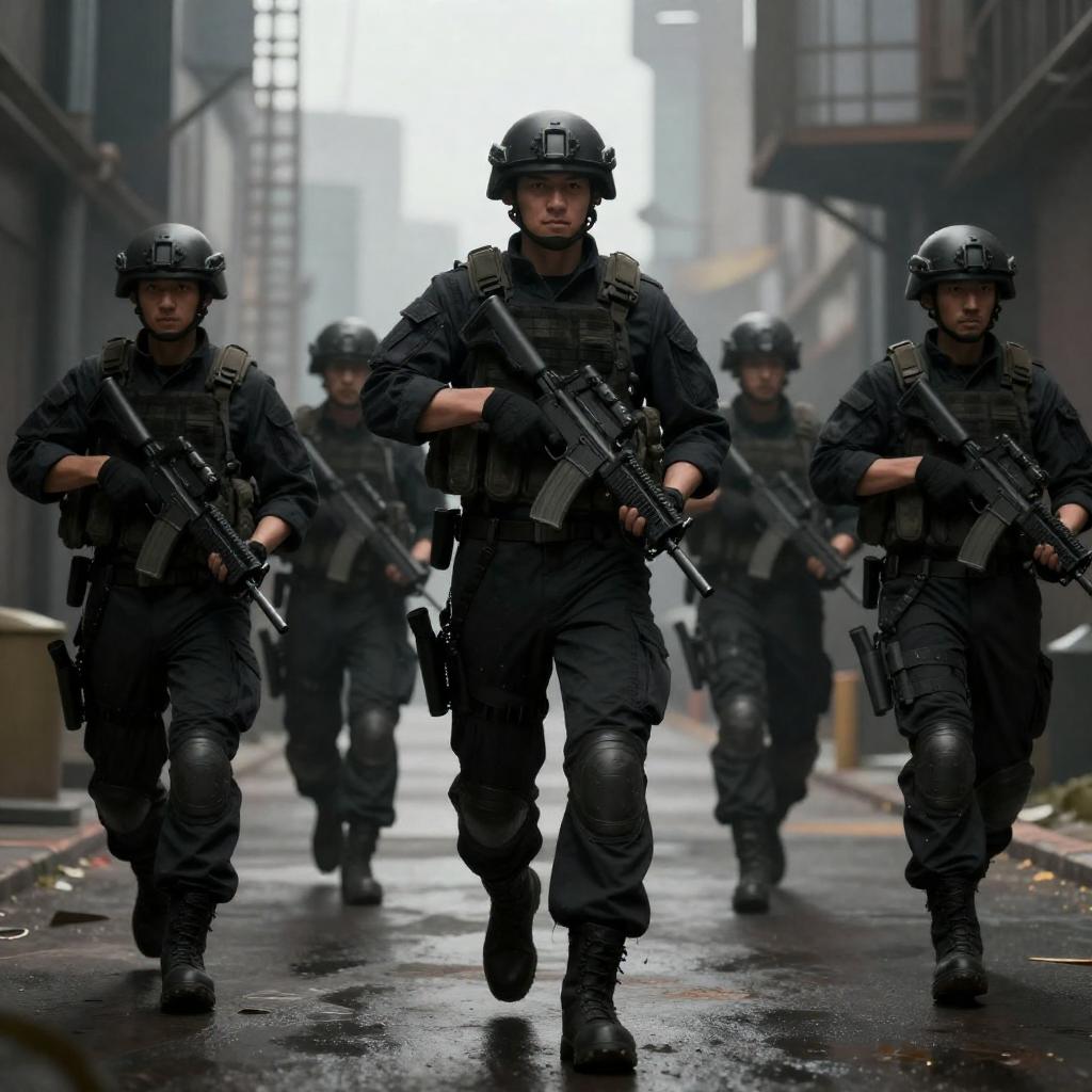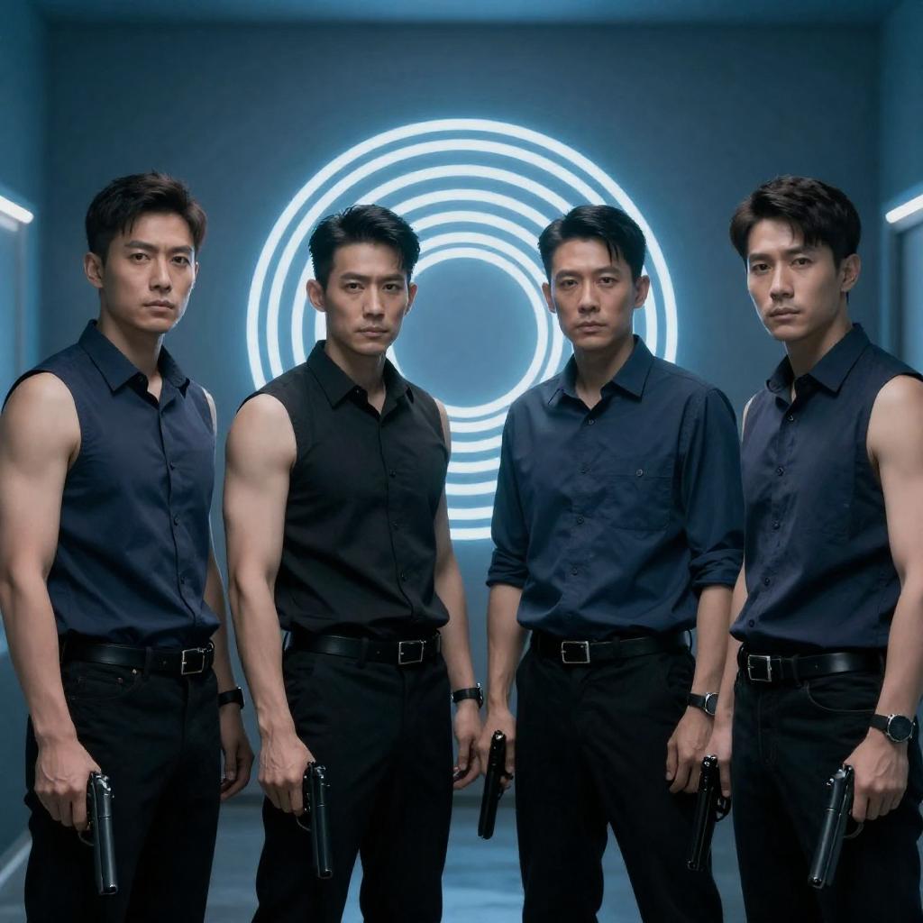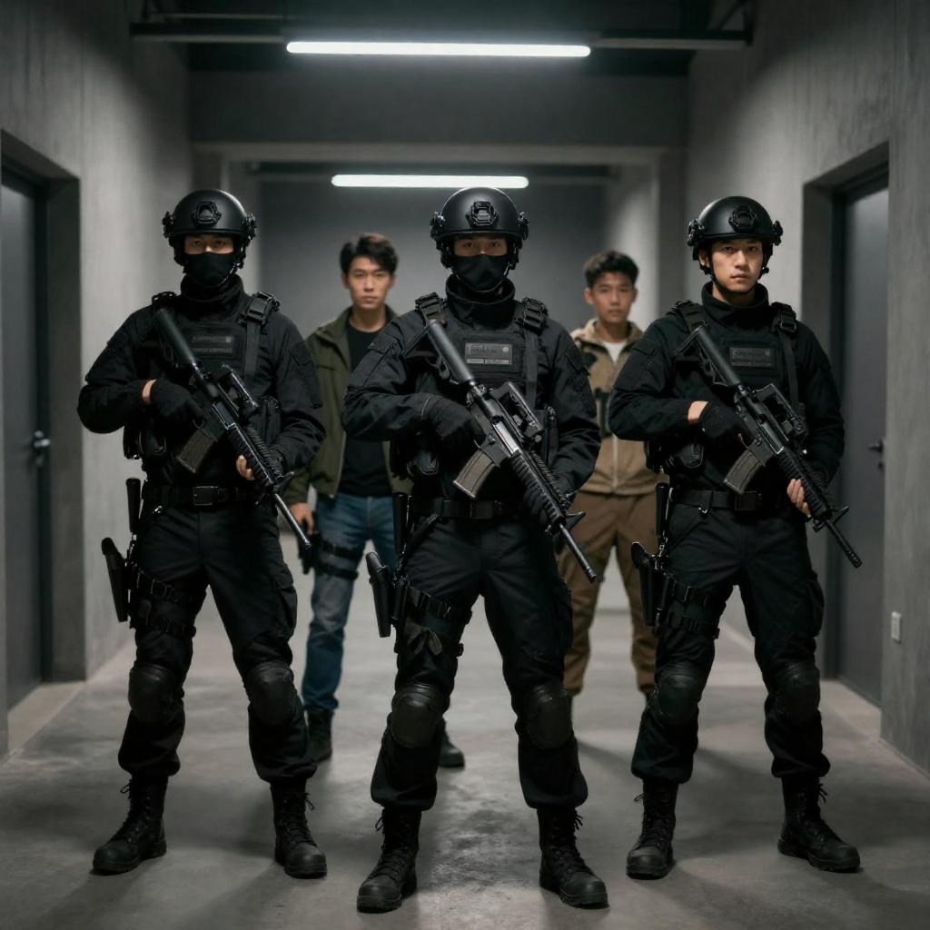 Photograph of four men in a modern, dimly lit hallway. Three armed, black-clad mercenaries with tactical gear and rifles stand in front, while a fourth man in a green jacket and jeans stands behind them, partially obscured. Two additional figures in the background wear brown and beige clothing. The scene is tense and dramatic.