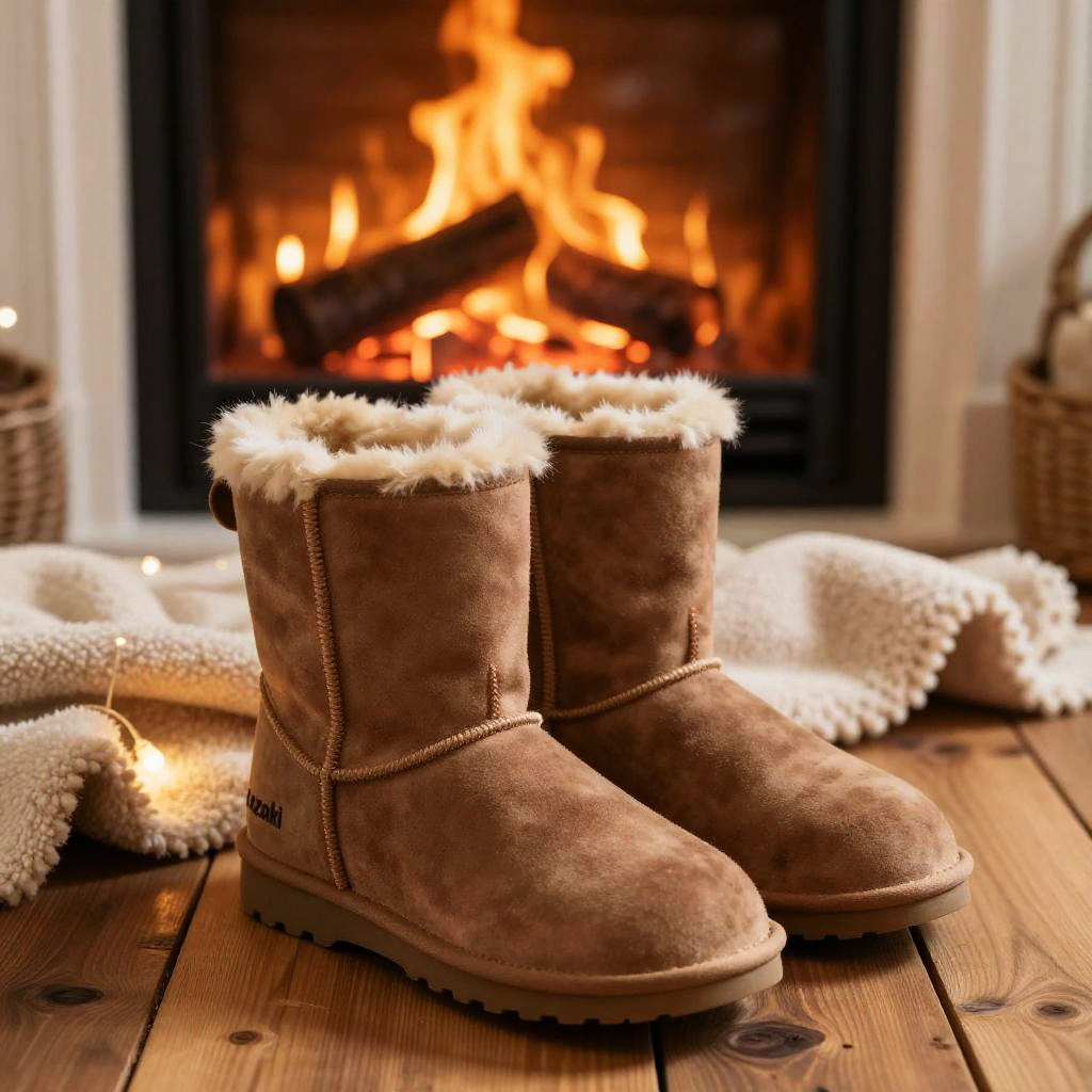 Kozaki comfortable winter boots placed by cozy fireplace setting, warm glowing lights around, plush blankets, rustic wooden floor, inviting and homely mood, detailed texture on suede and wool lining