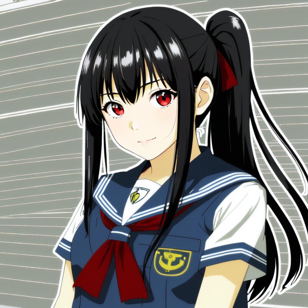 Digital anime-style drawing of a teenage girl with long black hair in a high ponytail, accented by a red ribbon. She has red eyes, a subtle smile, and is wearing a traditional Japanese school uniform with a navy blue sailor top, white shirt, and red necktie. The uniform features a yellow emblem on the left chest. The background is a simple grey with white horizontal lines. The girl's skin is fair, and the image emphasizes her cute and slightly mysterious appearance. The art style is characterized by bold lines and vibrant colors.