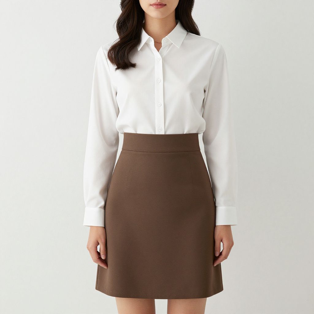 "Working Clothes Style Woman Costume, woman in a brown shirt and brown apron posing for a picture"