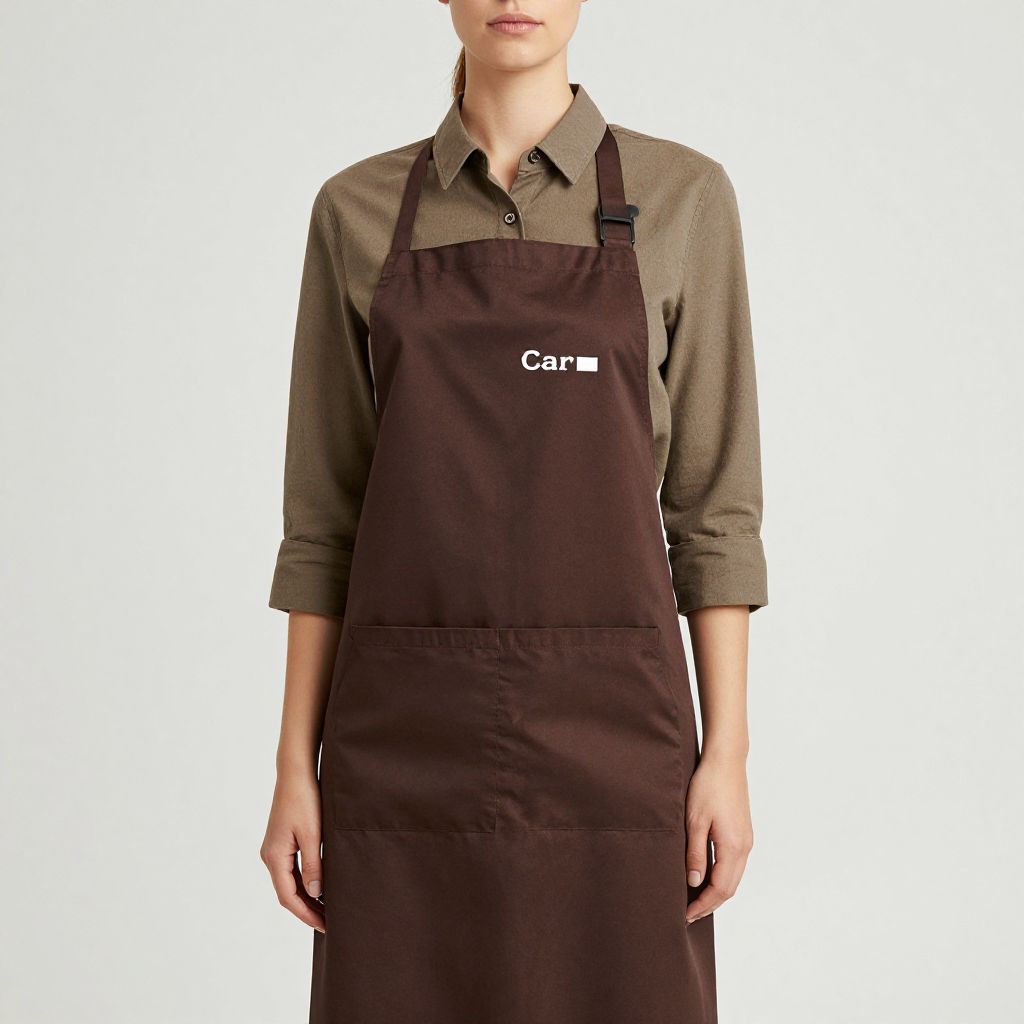 Photograph of a light-skinned person wearing a brown apron over a green button-up shirt, with a small "Carhartt" tag on
