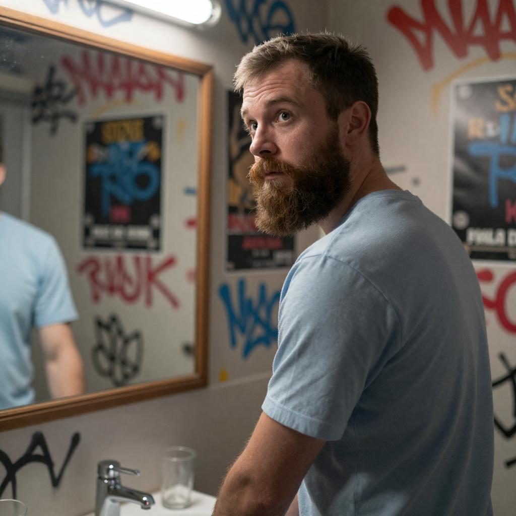 A bearded Caucasian man wearing a blue denim shirt and dark pants is crouching on a rocky path. He is holding a brown bottle in one hand and wearing black over-ear headphones. The background features a circular painting with floral motifs.