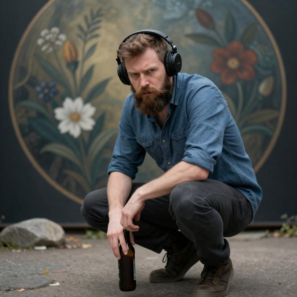 Bearded man with headphones, blue shirt, dark pants, holding bottle, intense expression, crouching, circular painting backdrop, flowers, rocky path.