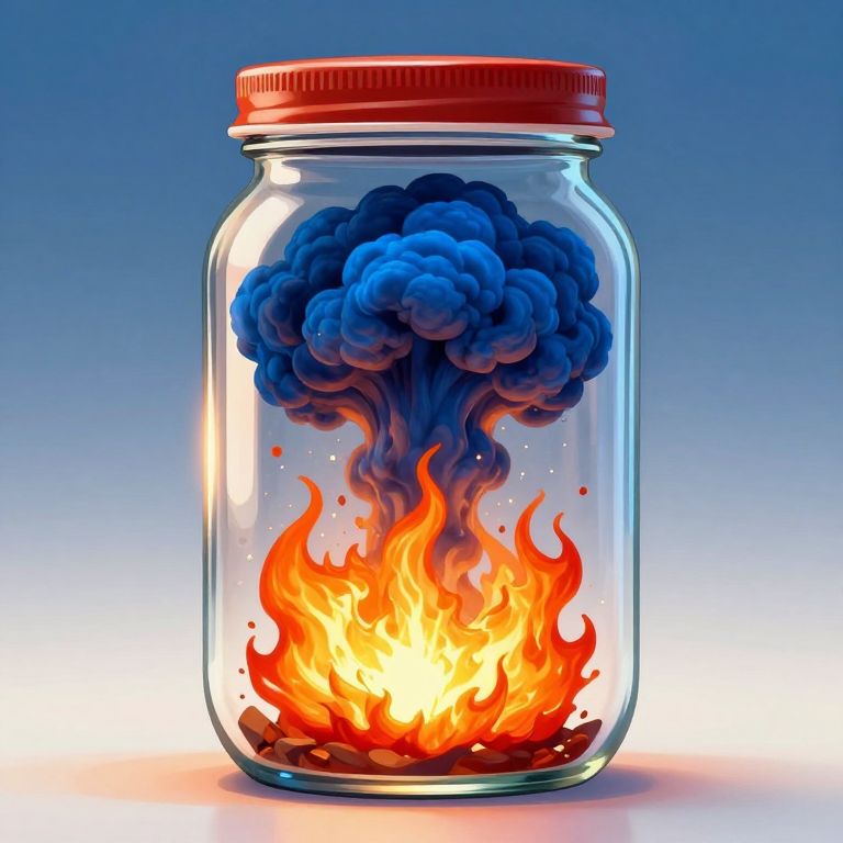Digital artwork of a glass jar with a red lid, containing a blue smoke explosion above a bright orange fire, set against a gradient blue-to-white background