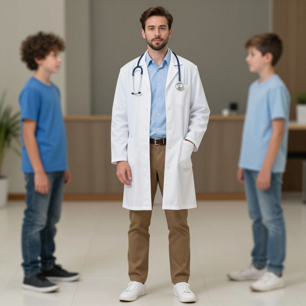 "doctor costume, lab coat, stethoscope, male focus, multiple boys, brown pants, brown hair, hand in pocket, facial hair, shoes, shirt, pants, solo focus, blurry, blue shirt, full body, 2boys, realistic, standing, blurry background, doctor, sneakers, beard Realistic photo of casual sexy person with pretty face"