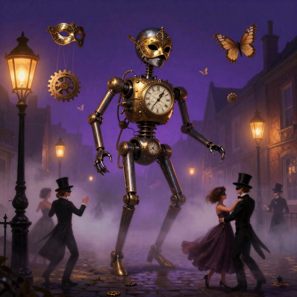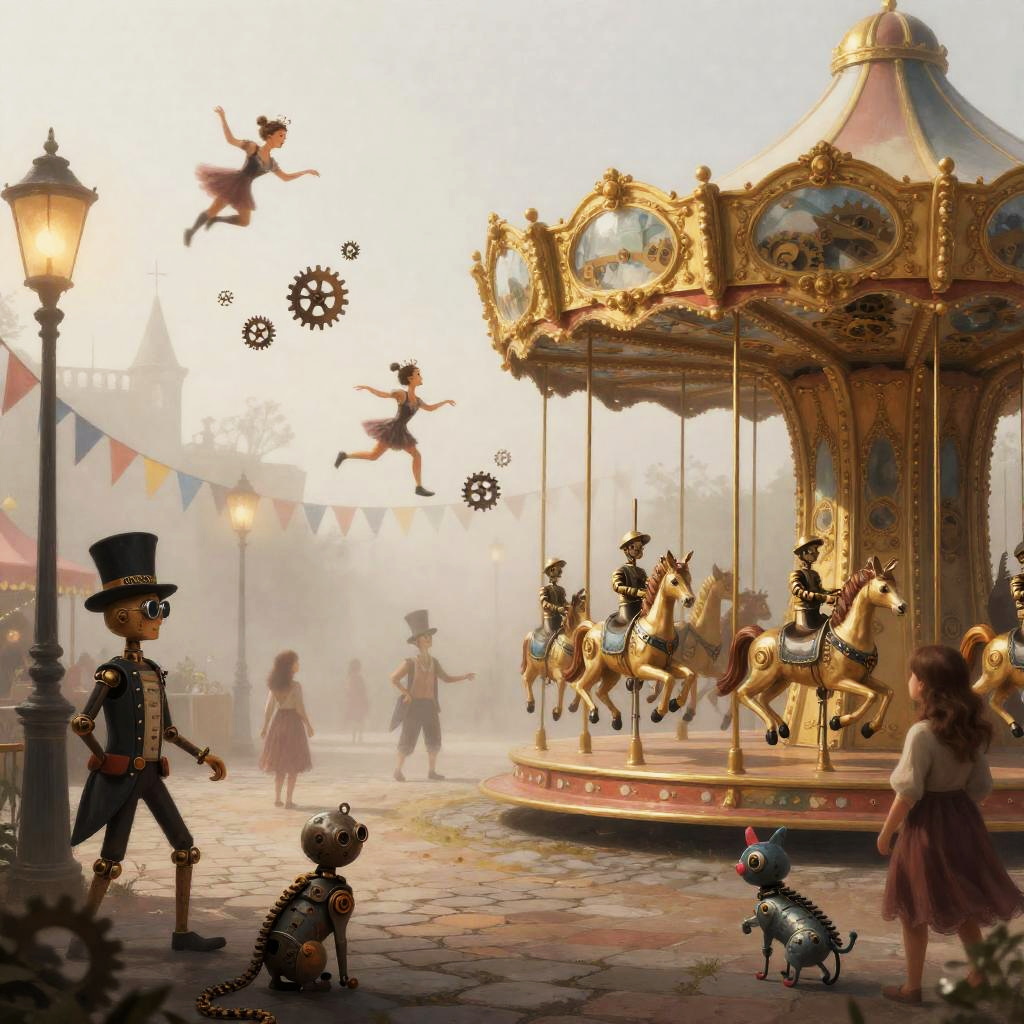 A whimsical clockwork fantasy, clockwork performers twirling and releasing tiny gears into the air, an ornate brass carousel with exposed gearwork and glass domes, fog-laced cobblestone promenade lined with flickering gas lamps and colorful bunting, top-hatted automatons, goggle-wearing acrobats, and curious carnival-goers with mechanical pets, digital painting masterpiece, trending on artstation and pixiv