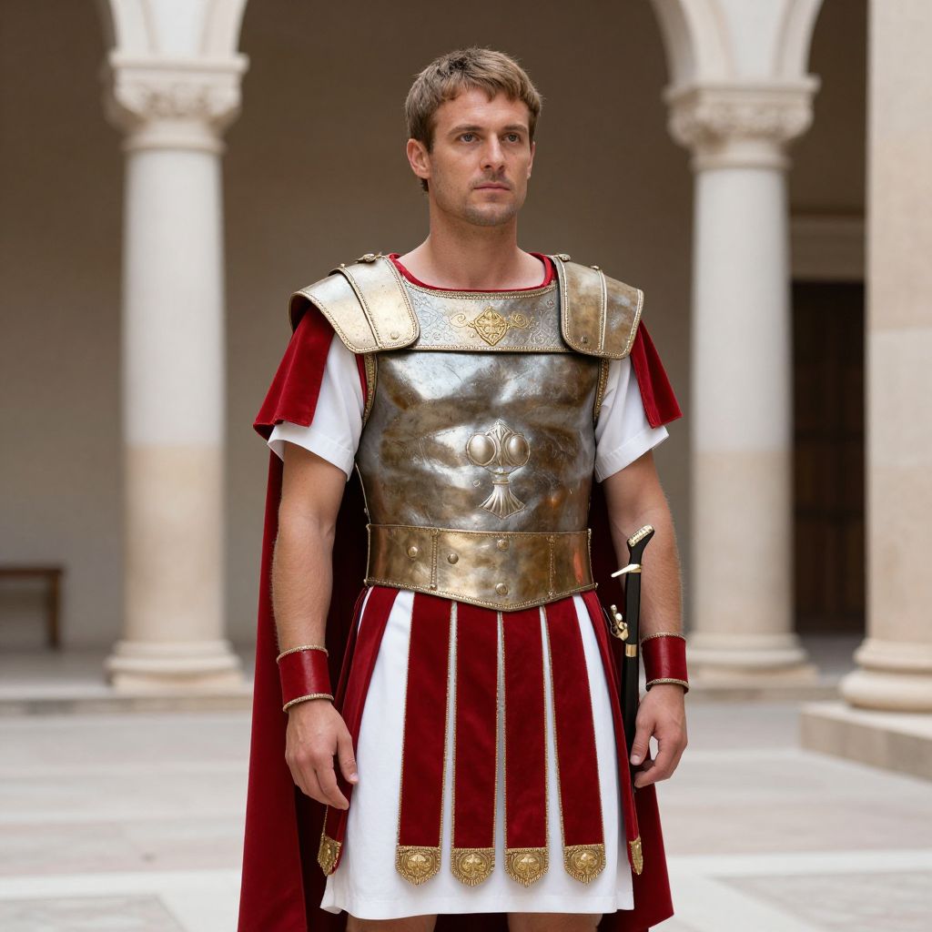Photograph of a young man in Roman-style armor with red and white tunic, gold accents, and red cape, standing in a colonnaded