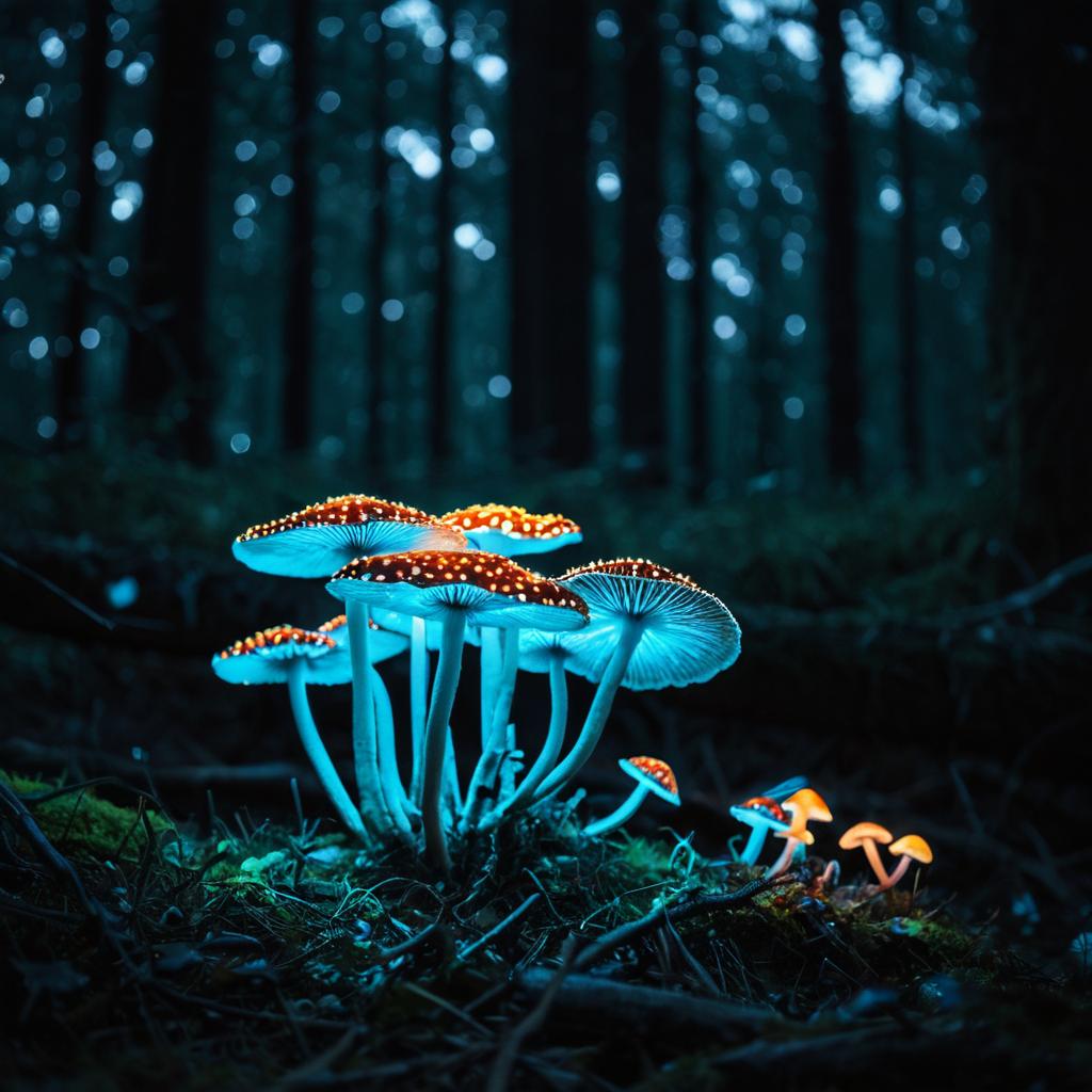 Woodland mushrooms, photorealistic, Stephen Rychteck-inspired fine art naturalism, Fujifilm X-T3, ISO 800, 60mm macro lens, highly detailed textures
