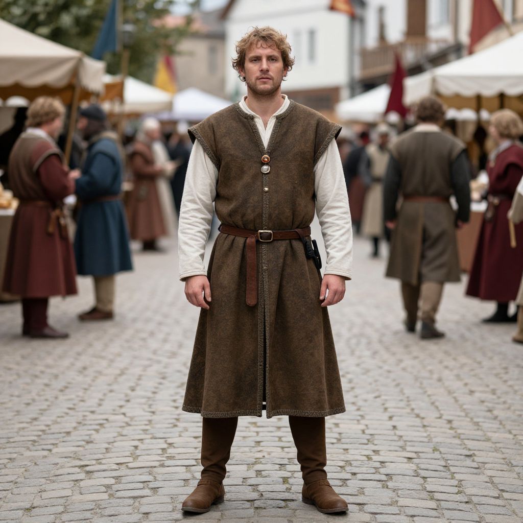 Medieval Fair Costume, man dressed in medieval clothing standing on a cobblestone street